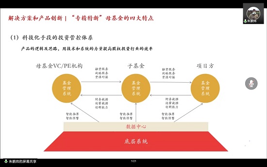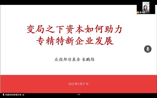 接下来,朱鹏炜博士提出了“专精特新”母基金的概念,他认为“专精特新”母基金是股权投资行业发展的产物,对投资具有放大效应,可以加速新兴产业的成长速度,实现多方共赢。最后,朱鹏炜博士分享了众投邦股份有限公司的主要投资领域以及投资原则。他指出,资本市场的走势往往是未来的发展方向,要关注有发展潜力的公司。抓住“专精特新”的发展机遇不仅能够促进国家经济的发展,也能实现个人财富的增长。