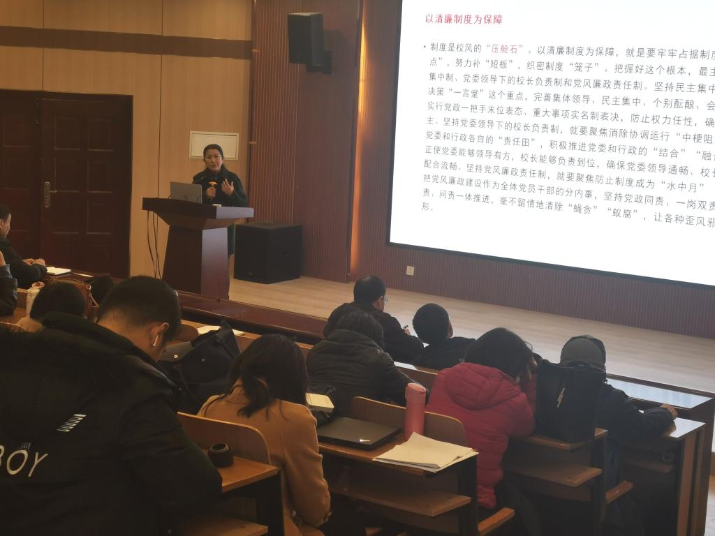 12月16日,校党委常委、副校长黄运平在崇德楼报告厅以《围绕立德树人 建设清廉高校》为题讲授廉政专题党课,管理学院、36365线路检测中心no1全体教职工参加报告会。