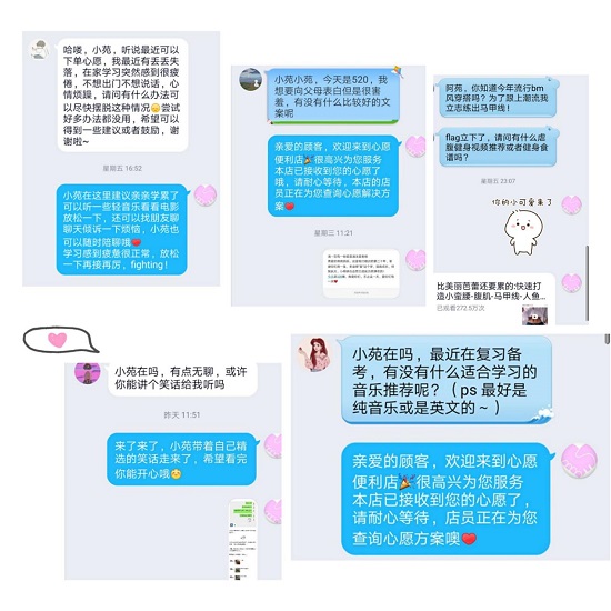 “心愿便利店“活动发出后,便收到了许多同学的心愿订单。有的同学在考试当前感到烦恼,想要建议和鼓励;有的同学想在520和父母表白,却没有好的文案;有的同学感到无聊,求推荐好看的电视剧,想听好笑的笑话,还有的同学最近对心理学感兴趣,求推荐心理方面的书籍……还有很多很多心愿订单,不一而足。在这里,“心愿便利店”倾听同学们的烦恼和小小心愿,尽可能的帮助同学们解决问题,给同学们带来开心和快乐。