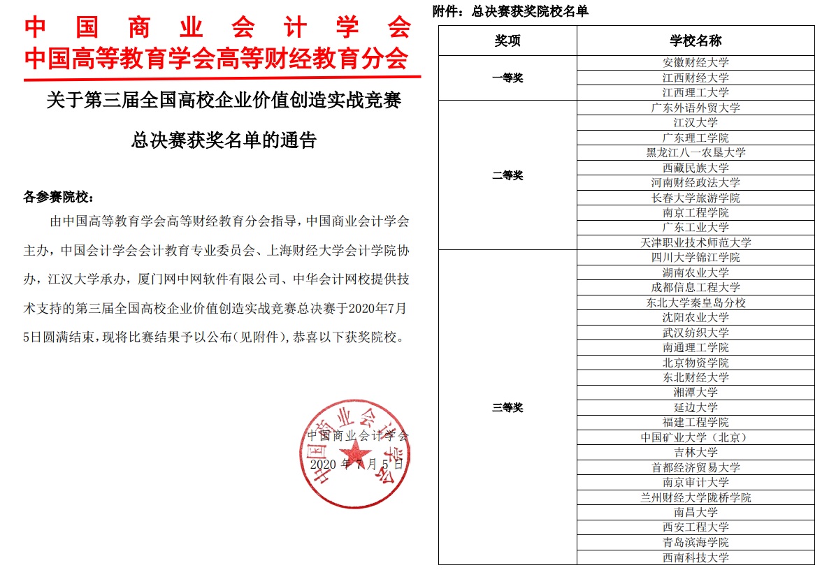 2020年7月5日,历时九个多月的第三届全国高校企业价值创造实战竞赛(Enterprise Value Creation Competition 简称 EVC大赛)经过校内赛、区域赛和全国总决赛多轮激烈角逐圆满结束,36365官网会计系杨晓锋老师和徐涛老师指导的学生团队戴雯、王青、汪鼎洋、李灵溪等四名同学喜获全国三等奖的优异成绩。