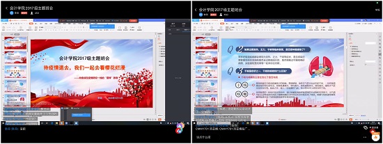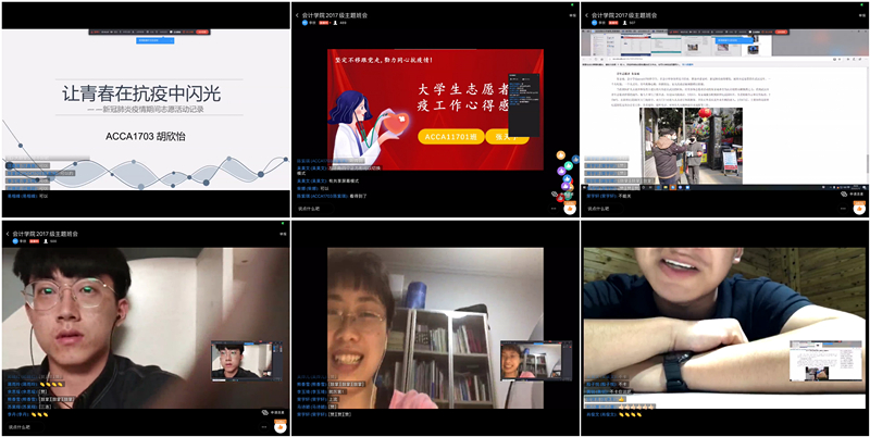 紧接着,李老师提到,两个多月以来2017级多名学生志愿者积极投身疫情防控阻击战、为社区居民提供帮助。本次班会上邀请了甘岱麟、胡欣怡、张天予,季海宁、朱家成五名学生志愿者为代表的防疫先进个人分享自己的抗疫故事和心得体会。学生们深受感动,积极点赞。为奉献者奉献,与逆行者同行,会计学子在战役中展现出了青年学子应有的担当。