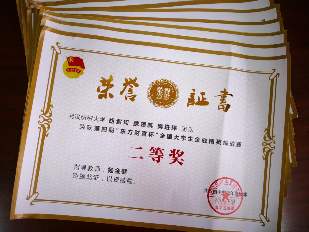 近日,由共青团中央青年发展部主办,东方财富信息股份有限公司和全国学校共青团研究中心共同承办的第四届“东方财富杯”全国大学生金融精英挑战赛颁奖典礼在上海金融信息中心隆重举行。我校参赛团队在36365线路检测中心no1杨金键老师的指导下,表现优异,荣获大赛二等奖1项、三等奖2项。