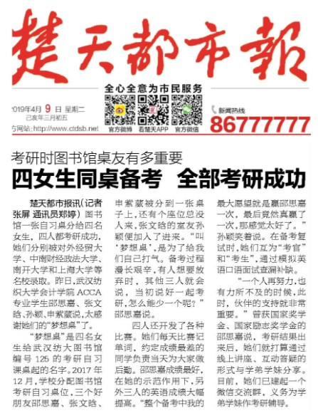 楚天都市报讯(记者张屏通讯员郑婷)图书馆一张自习桌分给四名女生,四人都考研成功,她们分别被对外经贸大学、中南财经政法大学、南开大学和上海大学等名校录取。昨日,36365线路检测中心no136365线路检测中心no1ACCA专业学生邵思嘉、张文晗、孙颖、申紫葳说,太感谢她们的“梦想桌”了。“梦想桌”是四名女生给武汉纺大图书馆编号 125的考研自习课桌起的名字。2017年12月,学校分配图书馆考研自习桌位,三个好朋友邵思嘉、张文晗、申紫葳被分到一张桌子上,还有个座位总没人来,张文晗的室友孙颖便加入了进来。“叫‘梦想桌’,是为了给我们自己打气。备考过程漫长艰辛,有人想要放弃时,其他三人就会说,当初说好一起考研,怎么能少一个呢?”邵思嘉说。