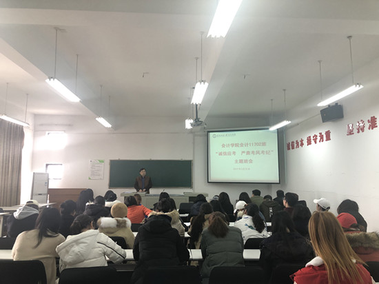 2月25日下午2点,会计11702班在07-402举行了“诚信应考,严肃考风考纪”主题班会。党委副书记姜永杰、辅导员彭慧以及会计11702班所有学生参加了此次班会。