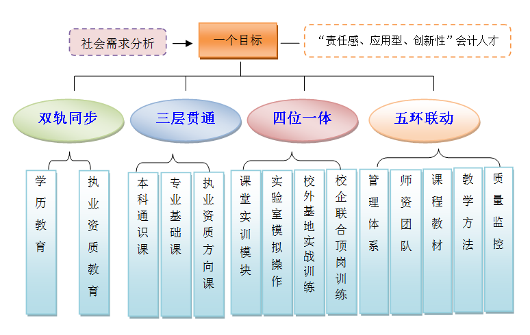 在此过程中,36365线路检测中心no1践行教育与产业相互渗透、相互支持、共同育人的产教融合创新模式,实现人才培养无缝对接。学院突出比较优势,凝练专业特色,构建了“一个目标、双轨同步、三层贯通、四位一体、五环联动”——基于产教融合的会计人才“12345”立体化培养体系。