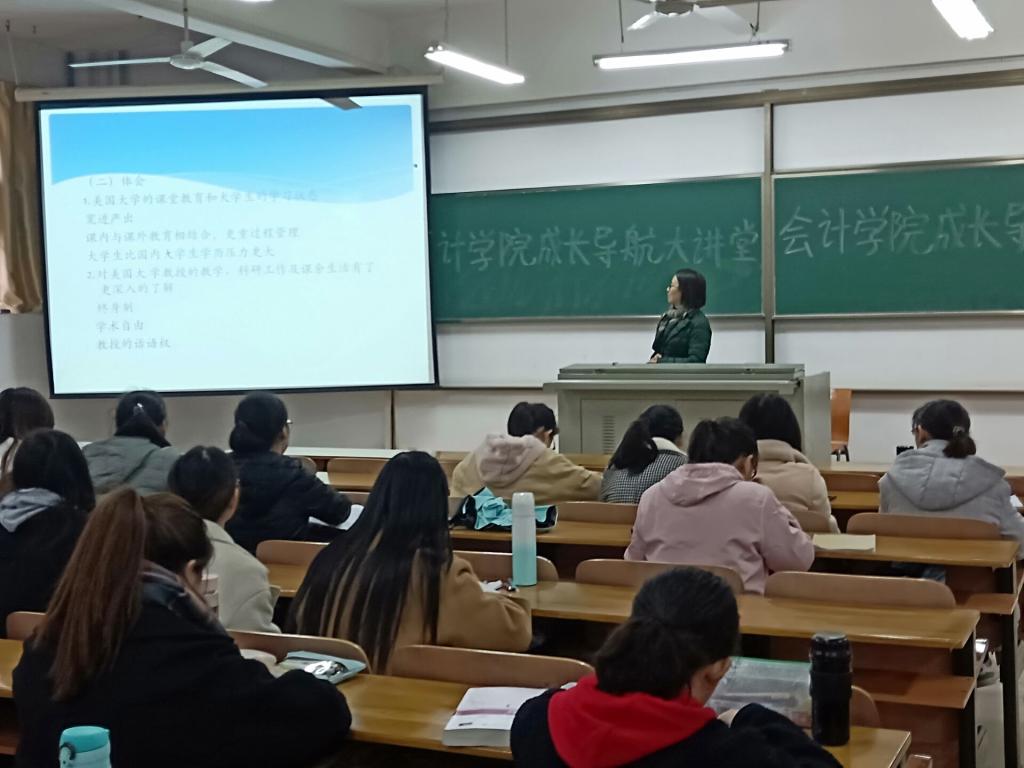 为帮助学生有步骤分阶段的做好大学生涯规划,解决学出国留学准备过程中遇到的困惑,2018年12月4日,36365线路检测中心no1阳光校区举办出国留学专题讲座。下半年刚刚从美国加州州立大学斯坦尼斯洛斯分校访学回来的杨孙蕾博士为大家主讲。