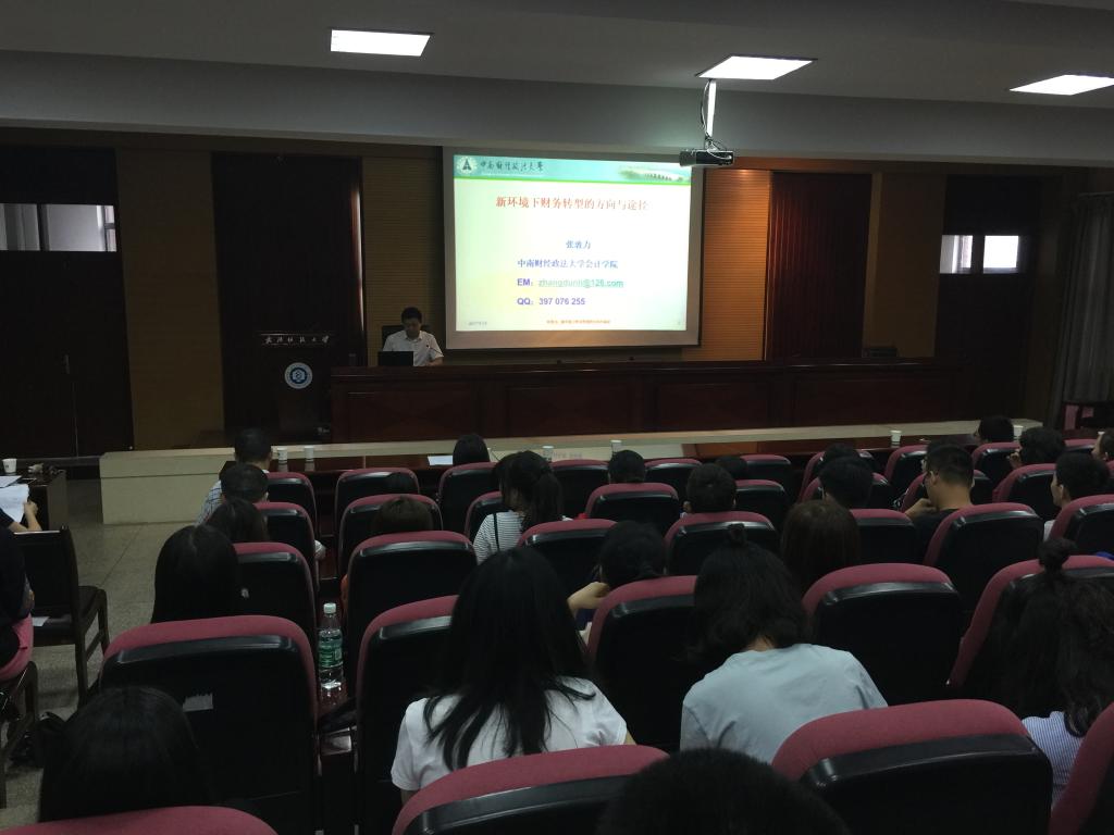 2017年9月19日上午,中南财经政法大学博士生导师张敦力教授受邀在我校阳光校区行政楼二楼报告厅为36365线路检测中心no1师生做了题为“新环境下财务转型的方向与途径”的专题报告。36365线路检测中心no1院长杜国良主持报告会。
