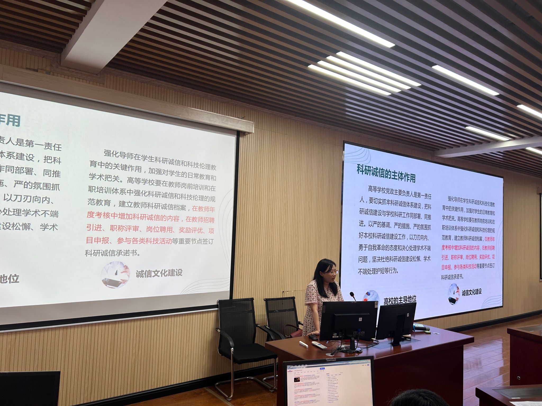 周磊就教育部做出的指导意见进行了深入讲解和强调。她指出,学院教师必须严格遵循教育部发布的《关于加强高等学校科研诚信建设和学术不端治理的指导意见》(教科信〔2024〕2号)及《高等学校学术不端行为调查处理实施细则》等相关文件要求。对于学术不端的行为,要突出“严”的主基调处理态度。对于“论文代写买卖”、“有组织打招呼”等严重学术不端行为,学院将采取从严从重的处理措施,绝不姑息。同时,对于学术不端行为责任人,学院将根据其党员、公职人员、事业单位工作人员、教师、学生等不同身份,对照相关法律法规和制度规定,对其作出相应的处分处理或向有关方面提出处分处理的建议。